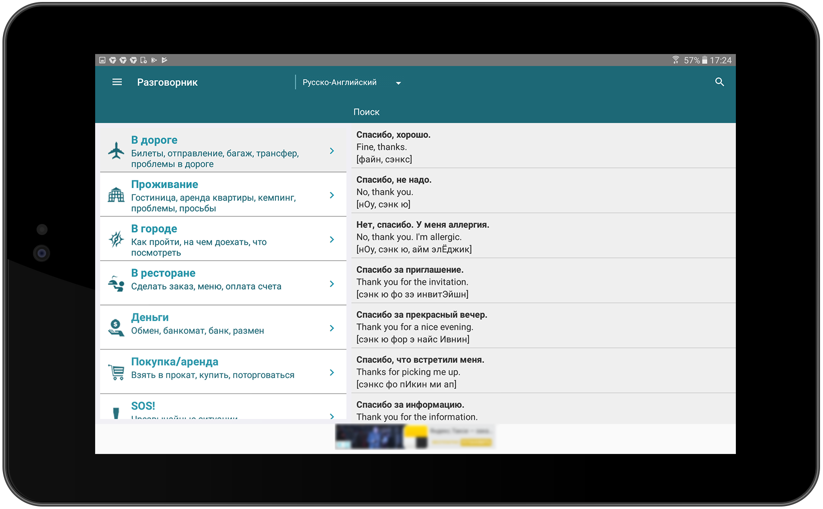 Поиск идет по всем разделам разговорника, как среди исходных фраз, так и по переводам.